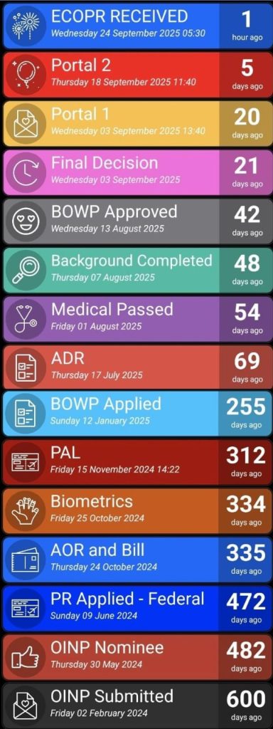 Se os prazos tivessem sido cumpridos, tinhamos recebido a residência permanente no dia 9 de maio de 2025. Não temos nenhuma notícia desde a PAL. A extensão eletrônica do BOWP também venceu no dia 9 de julho de 2025. Estamos num limbo, SIN number expirado, talvez não tenha acesso aos serviços públicos.
